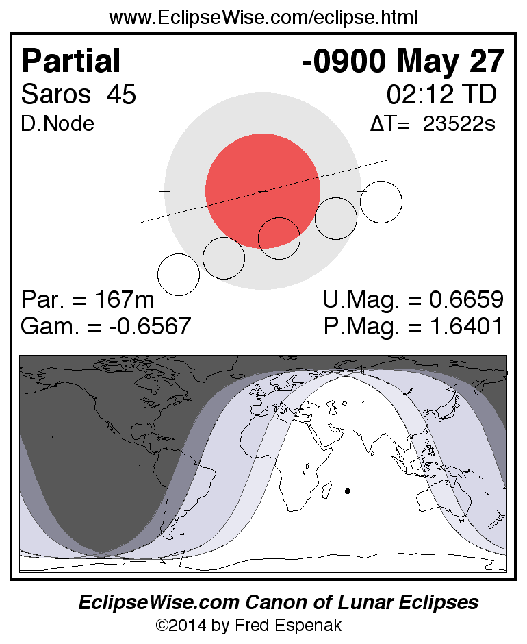 The instant of greatest eclipse takes place on -0900 May 27 at 02:11:31 TD (19:39:32 UT1).