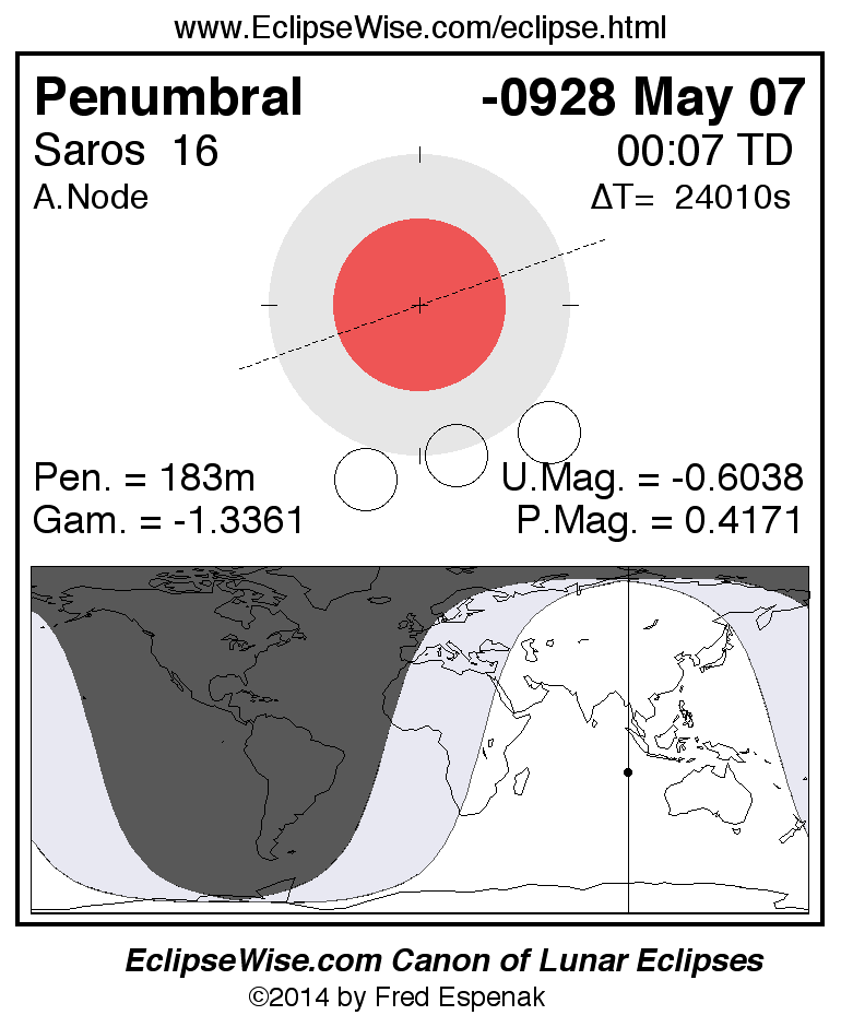 Penumbral Lunar Eclipse of -0928 May 07 (0929 May 07 BCE)