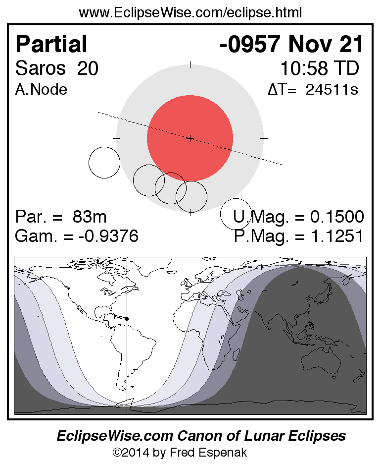 The instant of greatest eclipse takes place on -0957 Nov 21 at 10:58:17 TD (04:09:50 UT1).