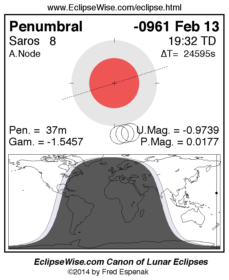 The instant of greatest eclipse takes place on -0961 Feb 13 at 19:31:48 TD (12:41:56 UT1).