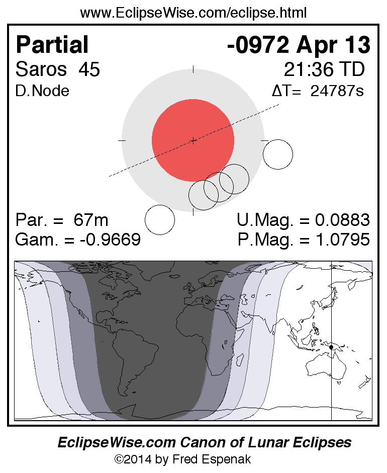 The partial lunar eclipse of -0972 Apr 13 is preceded two weeks earlier by a annular solar eclipse on -0972 Mar 30.