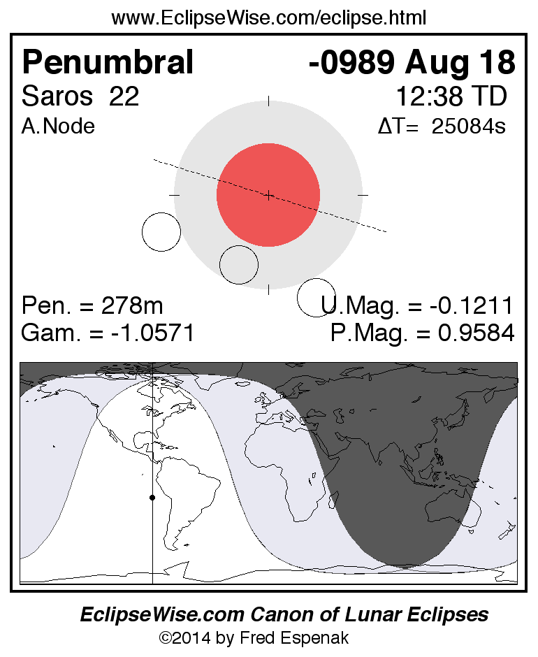 The instant of greatest eclipse takes place on -0989 Aug 18 at 12:37:33 TD (05:39:32 UT1).