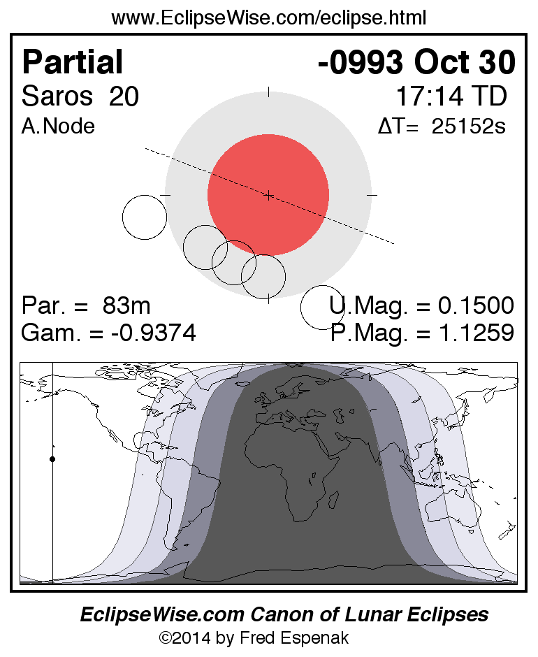 The instant of greatest eclipse takes place on -0993 Oct 30 at 17:14:26 TD (10:15:17 UT1).