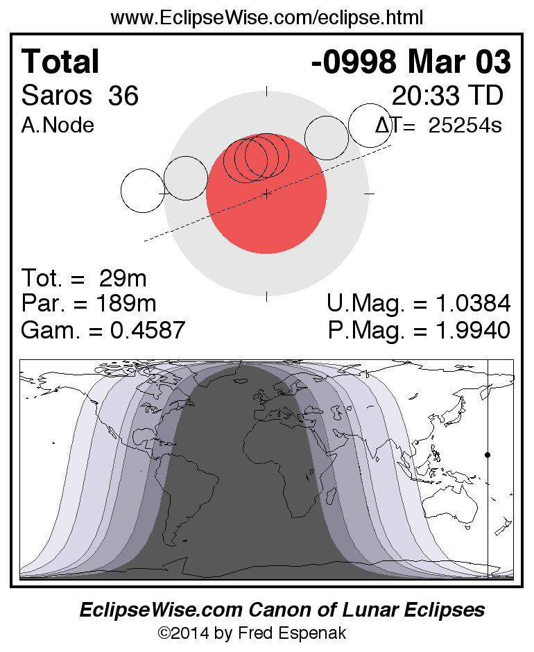 The instant of greatest eclipse takes place on -0998 Mar 03 at 20:33:11 TD (13:32:21 UT1).
