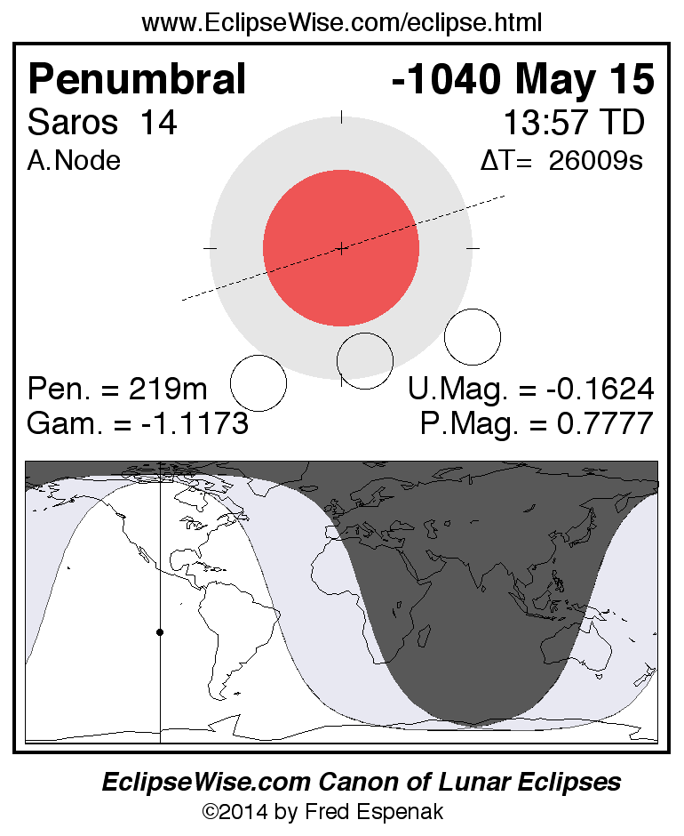 Another lunar eclipse occurs one synodic month after the -1040 May 15 eclipse. It is the penumbral lunar eclipse of -1040 Jun 13.