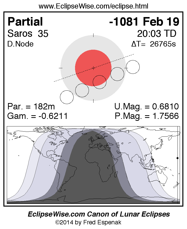 The instant of greatest eclipse takes place on -1081 Feb 19 at 20:03:08 TD (12:37:06 UT1).