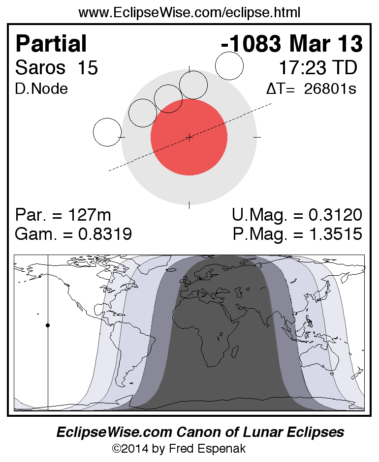 The partial lunar eclipse of -1083 Mar 13 is followed two weeks later by a total solar eclipse on -1083 Mar 27.