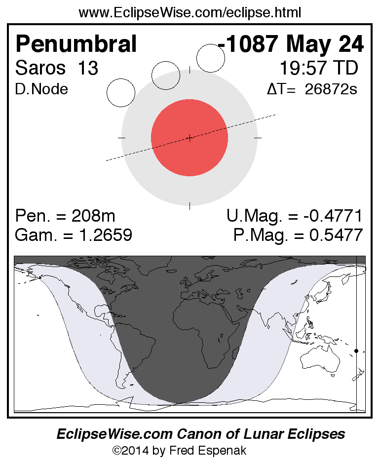 Another lunar eclipse occurs one synodic month after the -1087 May 24 eclipse. It is the penumbral lunar eclipse of -1087 Jun 23.