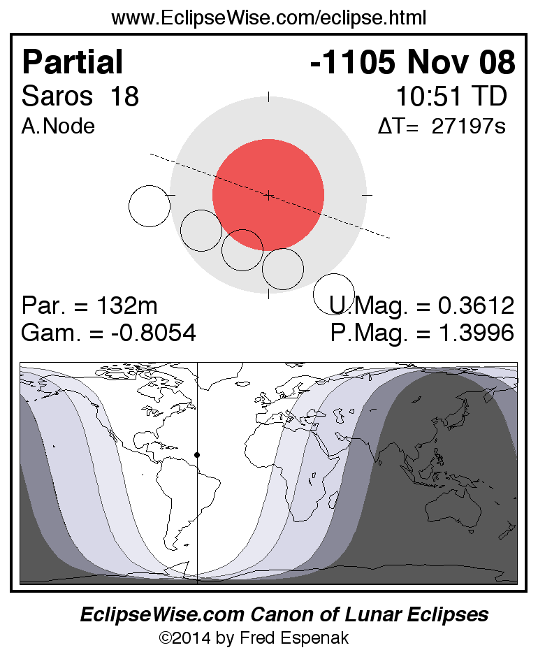 The instant of greatest eclipse takes place on -1105 Nov 08 at 10:51:02 TD (03:17:48 UT1).