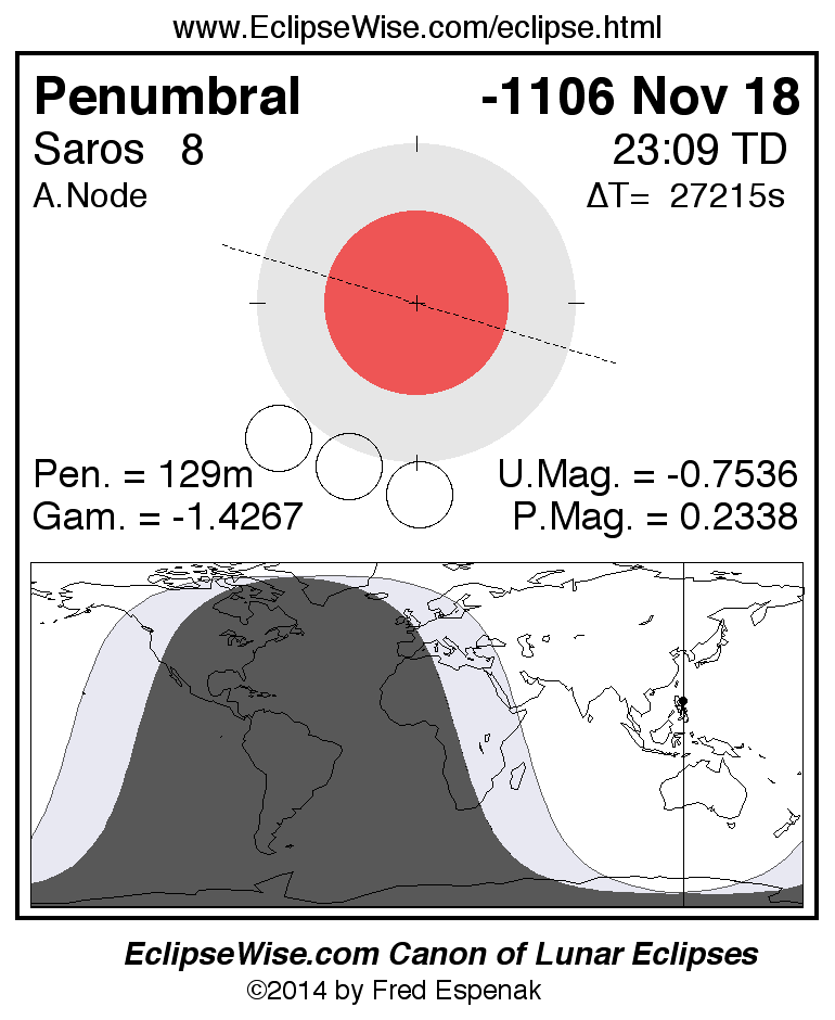 The instant of greatest eclipse takes place on -1106 Nov 18 at 23:09:28 TD (15:35:56 UT1).