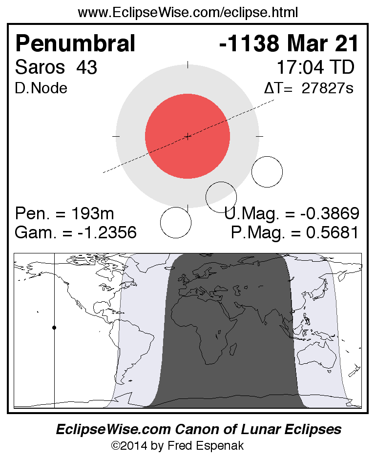 Another lunar eclipse occurs one synodic month before the -1138 Mar 21 eclipse. It is the penumbral lunar eclipse of -1138 Feb 20.