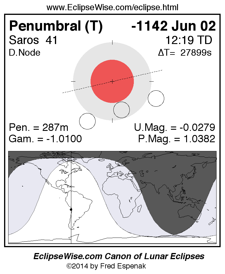 The penumbral lunar eclipse of -1142 Jun 02 is preceded two weeks earlier by a total solar eclipse on -1142 May 18.