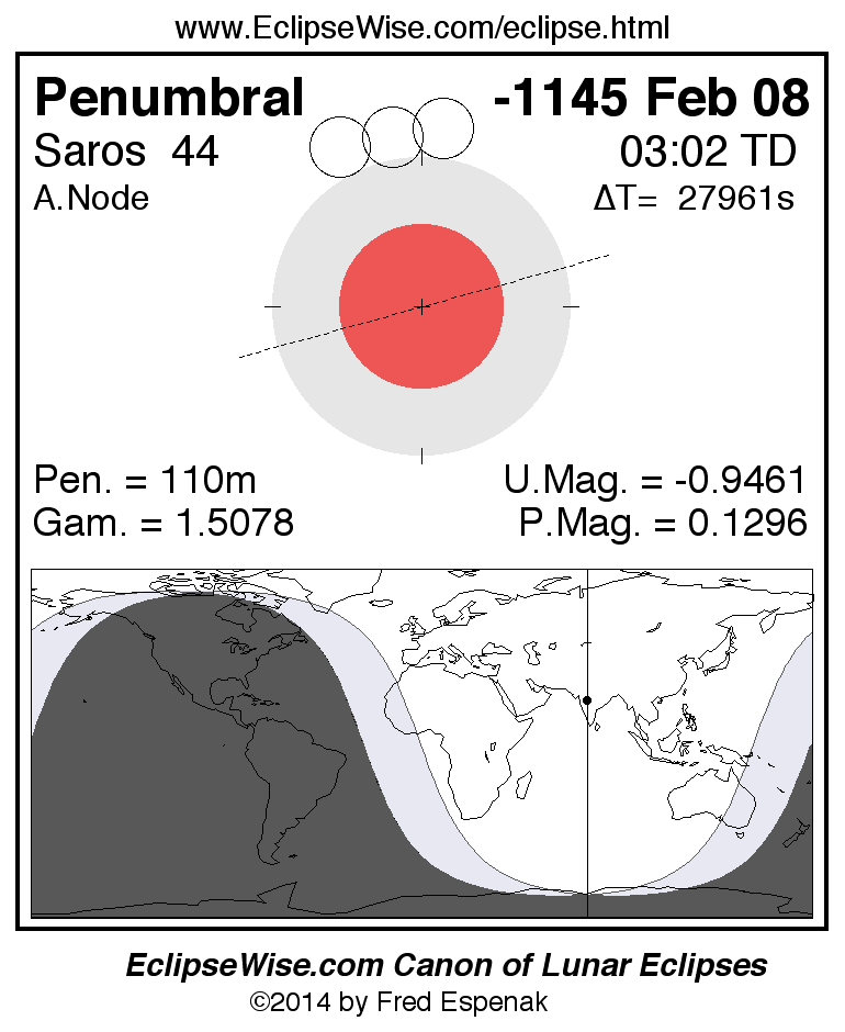 Another lunar eclipse occurs one synodic month before the -1145 Feb 08 eclipse. It is the penumbral lunar eclipse of -1145 Jan 09.