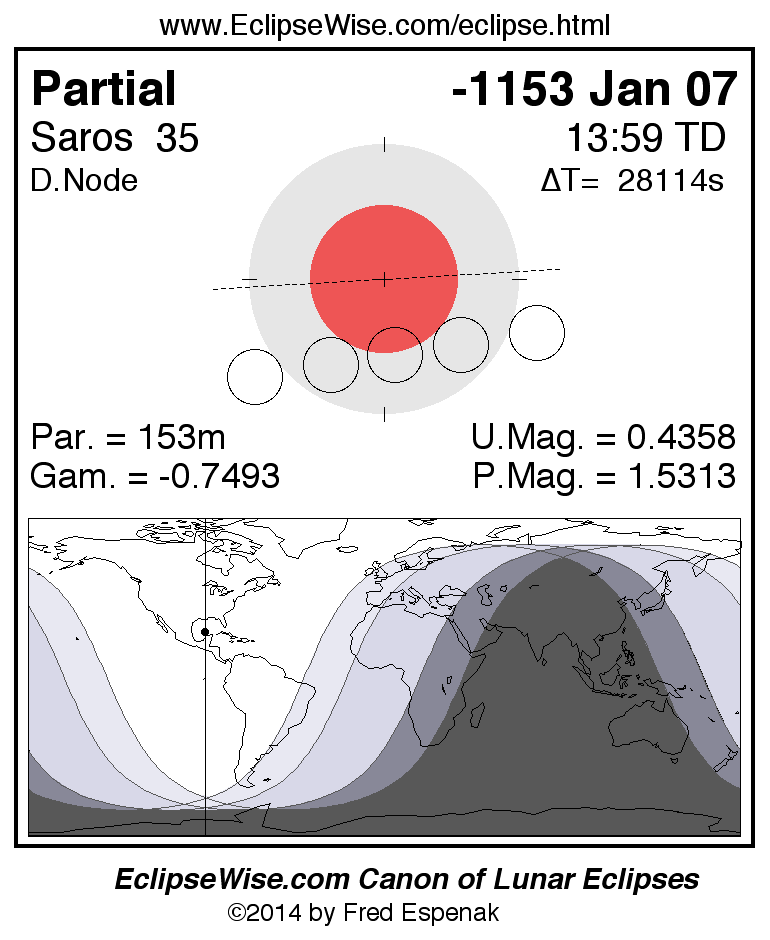 The instant of greatest eclipse takes place on -1153 Jan 07 at 13:59:26 TD (06:10:56 UT1).