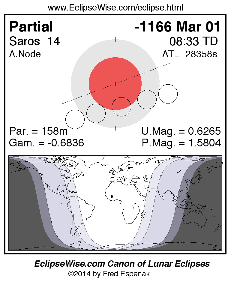The instant of greatest eclipse takes place on -1166 Mar 01 at 08:32:39 TD (00:40:04 UT1).