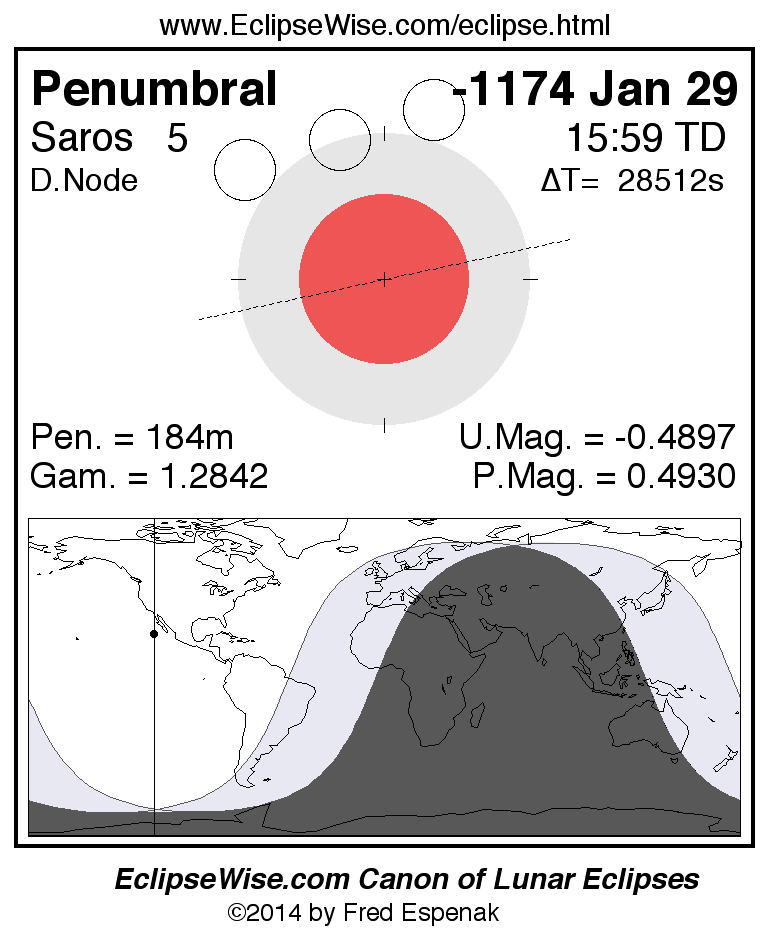 Another lunar eclipse occurs one synodic month after the -1174 Jan 29 eclipse. It is the penumbral lunar eclipse of -1174 Feb 28.