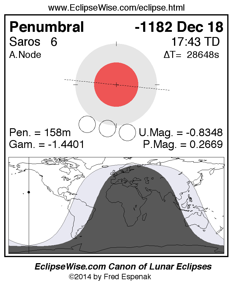 Another lunar eclipse occurs one synodic month after the -1182 Dec 18 eclipse. It is the penumbral lunar eclipse of -1181 Jan 17.