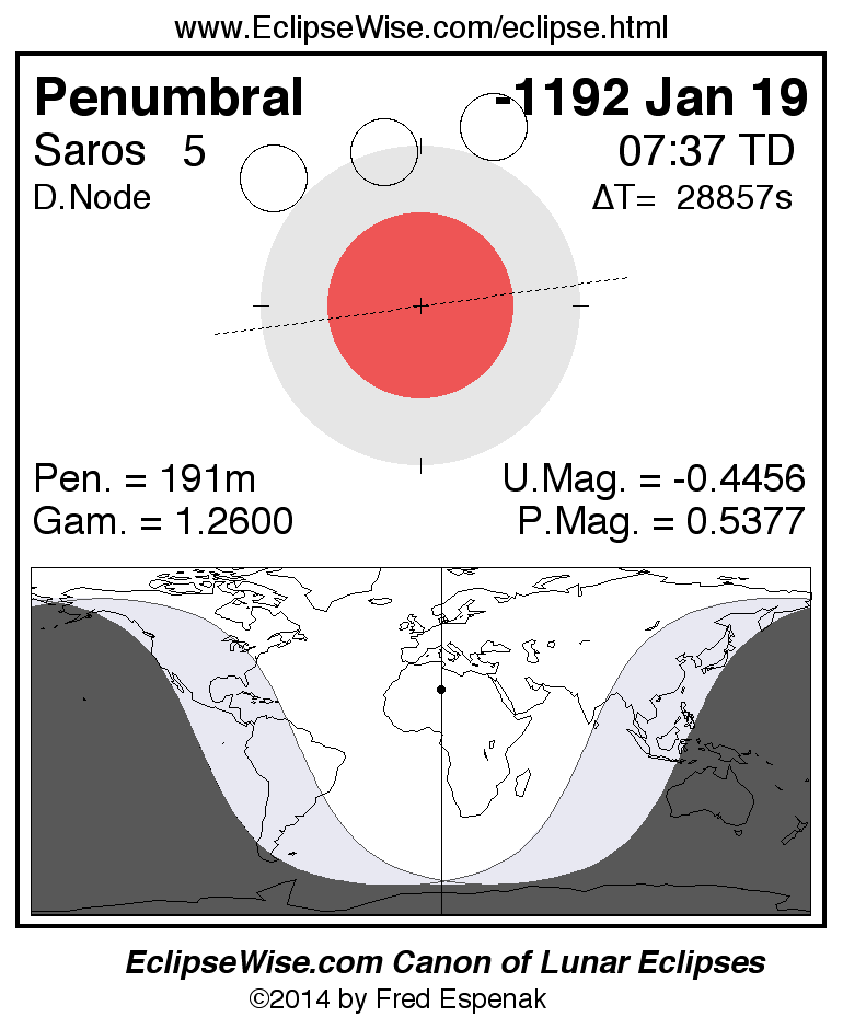 Another lunar eclipse occurs one synodic month after the -1192 Jan 19 eclipse. It is the penumbral lunar eclipse of -1192 Feb 17.