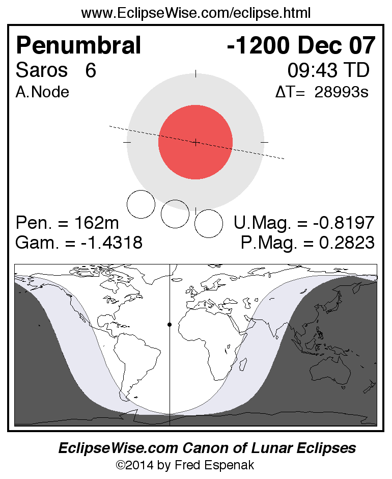 Another lunar eclipse occurs one synodic month after the -1200 Dec 07 eclipse. It is the penumbral lunar eclipse of -1199 Jan 06.