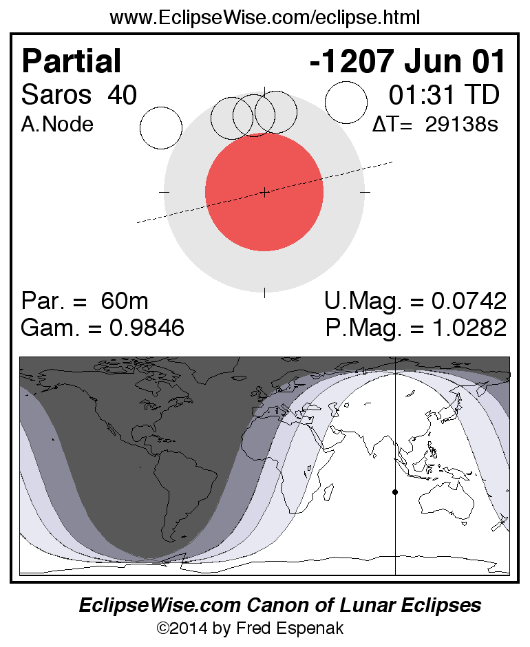 The instant of greatest eclipse takes place on -1207 Jun 01 at 01:31:17 TD (17:25:42 UT1).