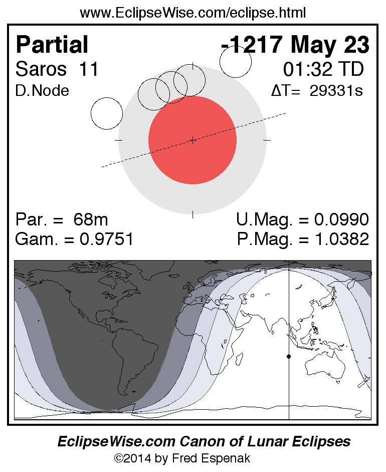 The instant of greatest eclipse takes place on -1217 May 23 at 01:31:56 TD (17:23:08 UT1).