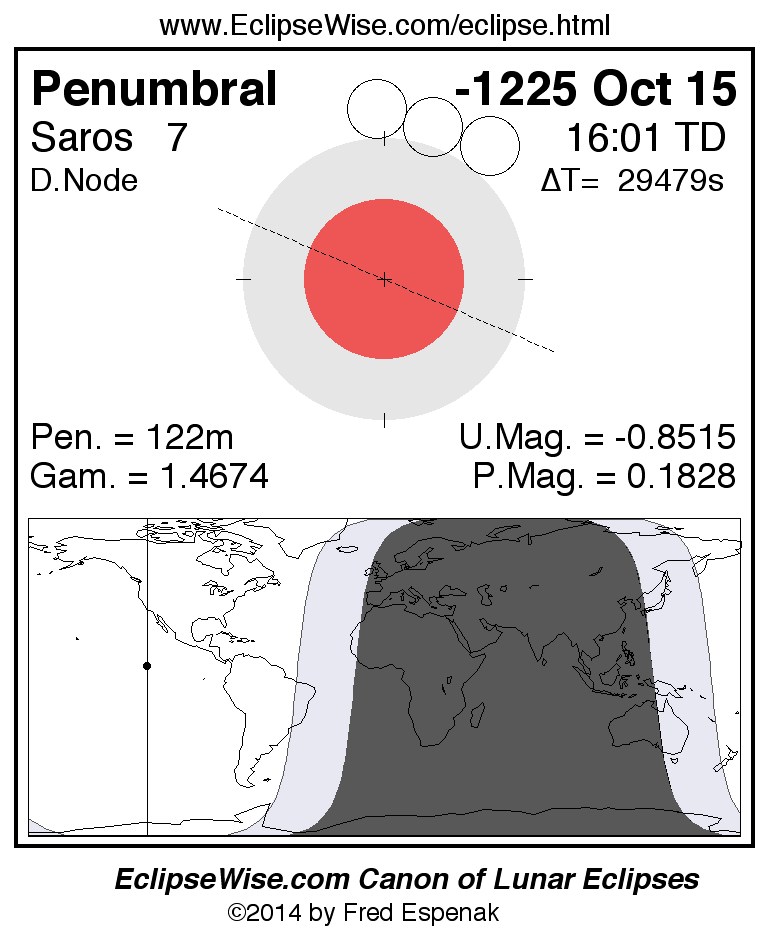Another lunar eclipse occurs one synodic month after the -1225 Oct 15 eclipse. It is the penumbral lunar eclipse of -1225 Nov 14.