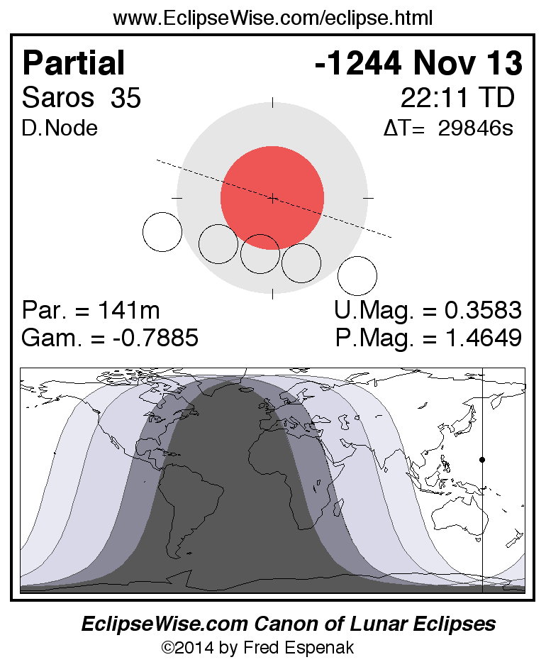 The instant of greatest eclipse takes place on -1244 Nov 13 at 22:10:33 TD (13:53:10 UT1).