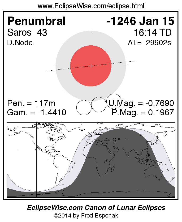 Another lunar eclipse occurs one synodic month before the -1246 Jan 15 eclipse. It is the penumbral lunar eclipse of -1247 Dec 17.
