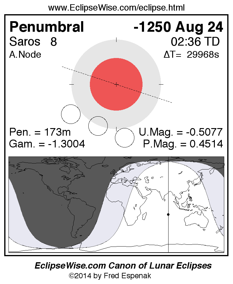 Another lunar eclipse occurs one synodic month after the -1250 Aug 24 eclipse. It is the penumbral lunar eclipse of -1250 Sep 22.