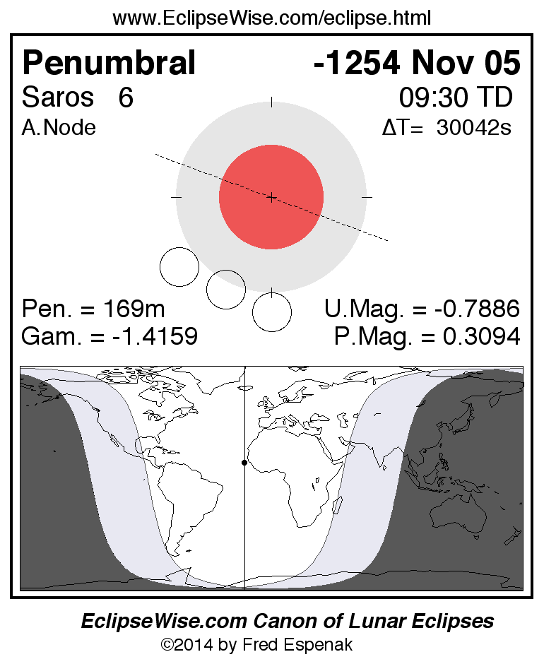 The instant of greatest eclipse takes place on -1254 Nov 05 at 09:29:51 TD (01:09:13 UT1).