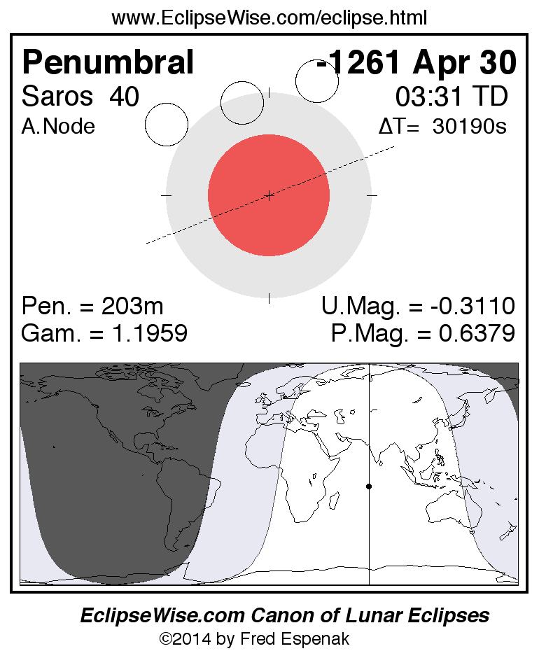 Another lunar eclipse occurs one synodic month before the -1261 Apr 30 eclipse. It is the penumbral lunar eclipse of -1261 Mar 31.