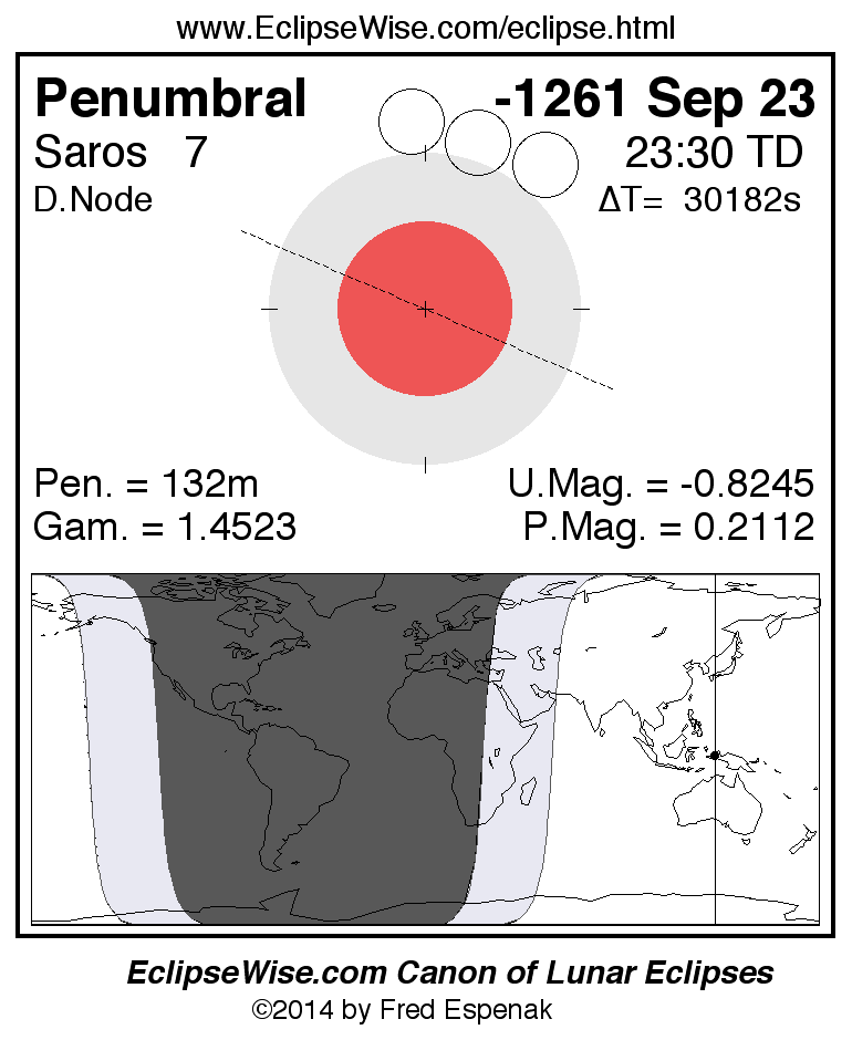 Another lunar eclipse occurs one synodic month after the -1261 Sep 23 eclipse. It is the penumbral lunar eclipse of -1261 Oct 23.