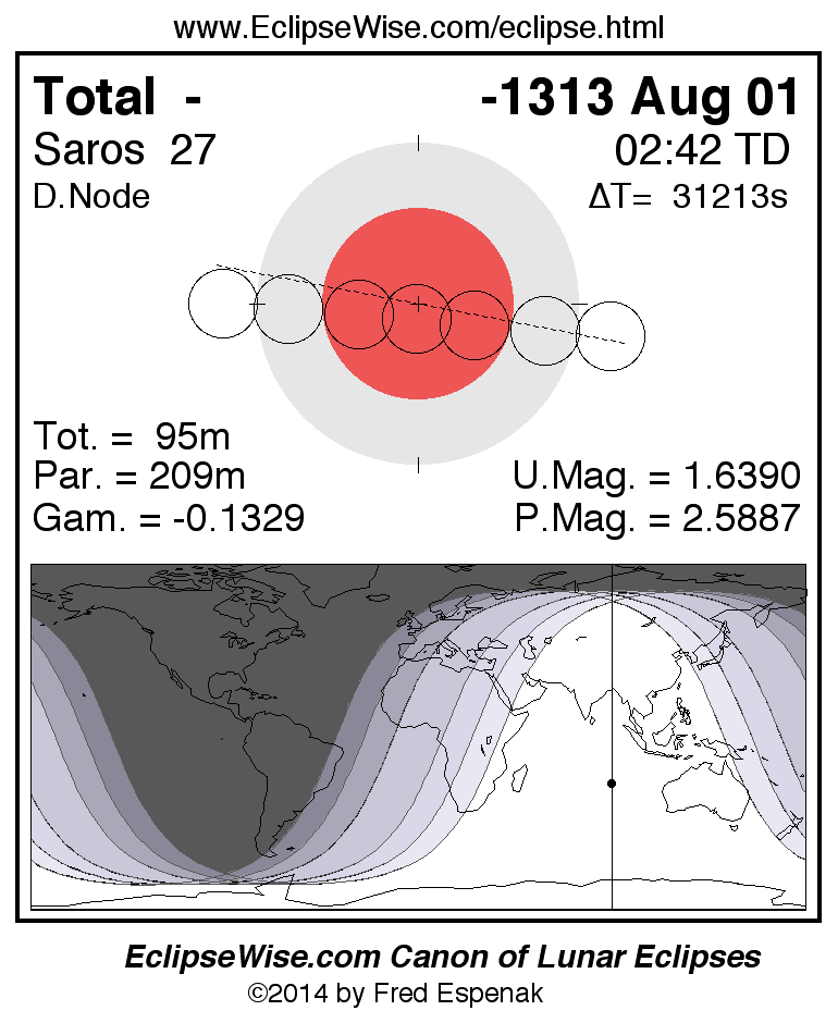 The instant of greatest eclipse takes place on -1313 Aug 01 at 02:42:24 TD (18:02:15 UT1).