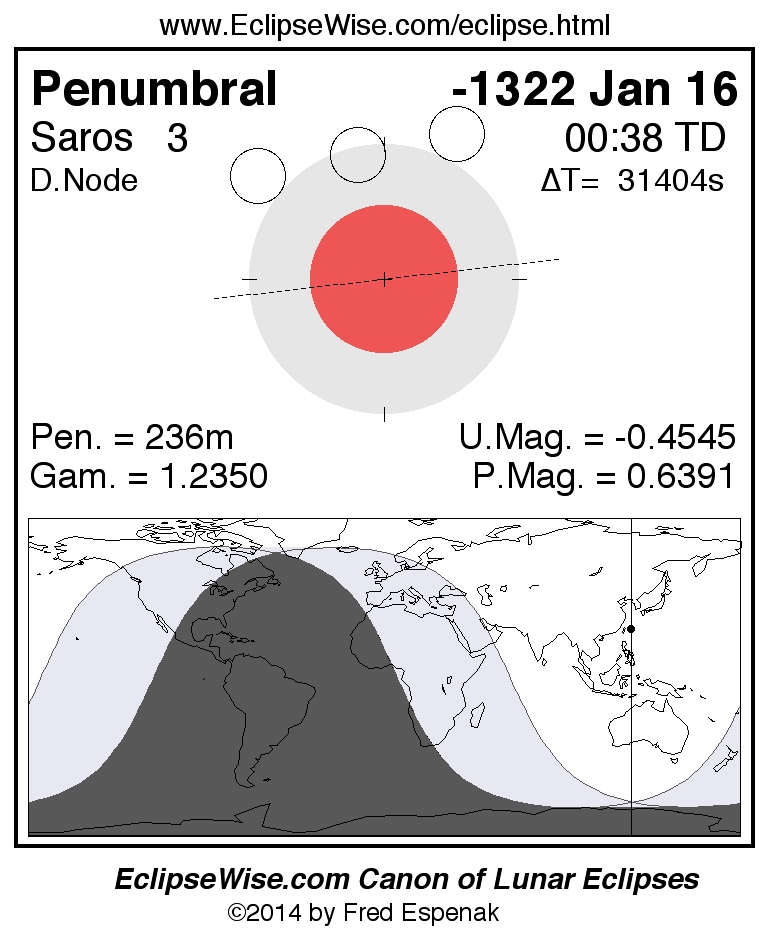 The penumbral lunar eclipse of -1322 Jan 16 is followed two weeks later by a total solar eclipse on -1322 Jan 30.