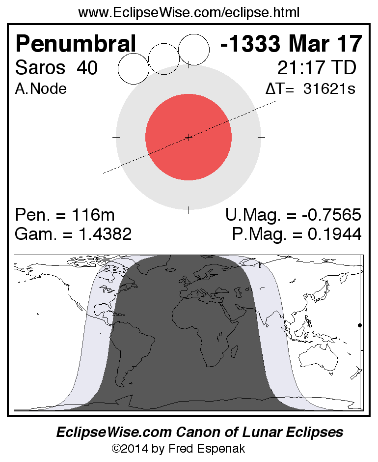 Another lunar eclipse occurs one synodic month before the -1333 Mar 17 eclipse. It is the penumbral lunar eclipse of -1333 Feb 16.