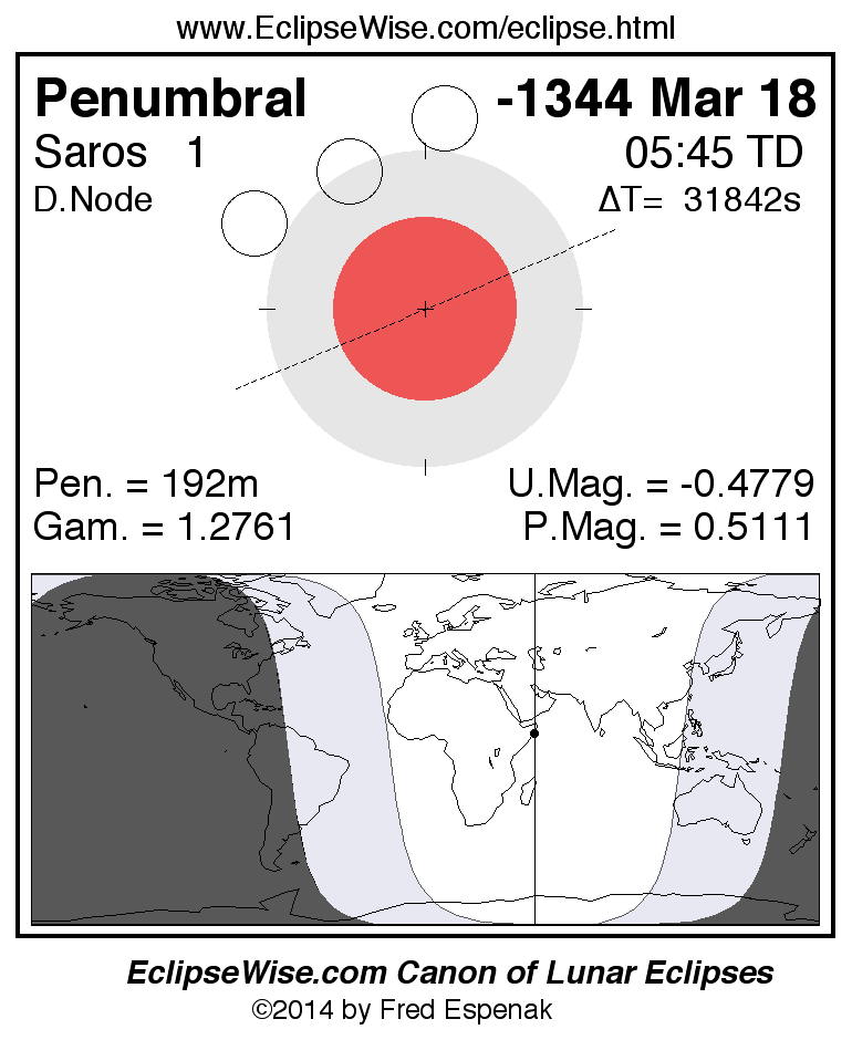 Another lunar eclipse occurs one synodic month after the -1344 Mar 18 eclipse. It is the penumbral lunar eclipse of -1344 Apr 16.