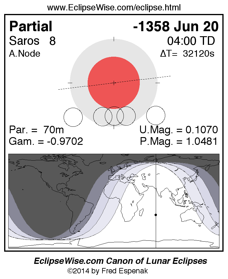 The instant of greatest eclipse takes place on -1358 Jun 20 at 04:00:23 TD (19:05:07 UT1).