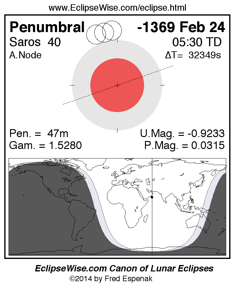 Another lunar eclipse occurs one synodic month before the -1369 Feb 24 eclipse. It is the penumbral lunar eclipse of -1369 Jan 25.
