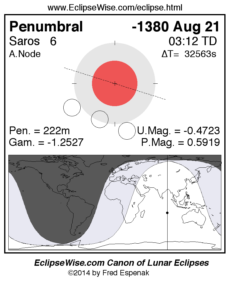 The instant of greatest eclipse takes place on -1380 Aug 21 at 03:11:56 TD (18:09:17 UT1).