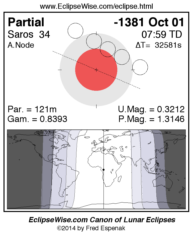 The instant of greatest eclipse takes place on -1381 Oct 01 at 07:58:48 TD (22:55:51 UT1).