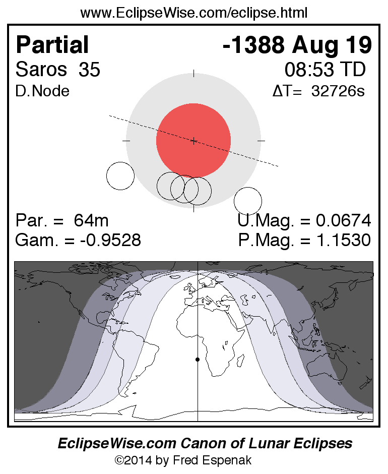 The instant of greatest eclipse takes place on -1388 Aug 19 at 08:52:54 TD (23:47:32 UT1).
