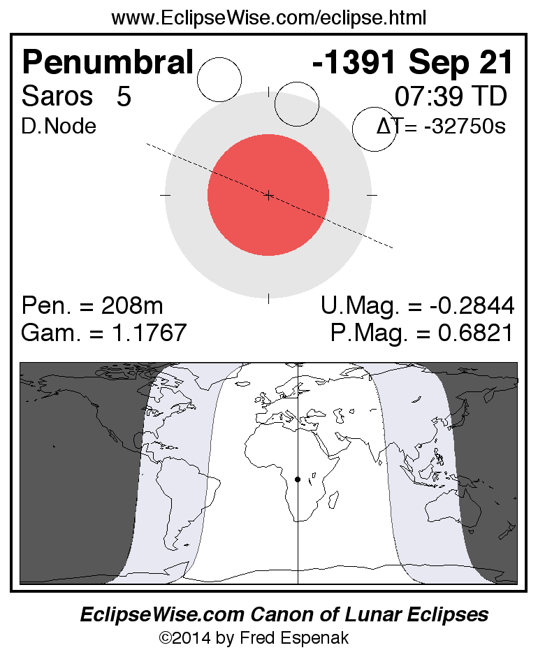 Another lunar eclipse occurs one synodic month after the -1391 Sep 21 eclipse. It is the penumbral lunar eclipse of -1391 Oct 20.