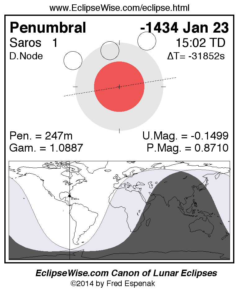 The instant of greatest eclipse takes place on -1434 Jan 23 at 15:01:34 TD (05:40:14 UT1).