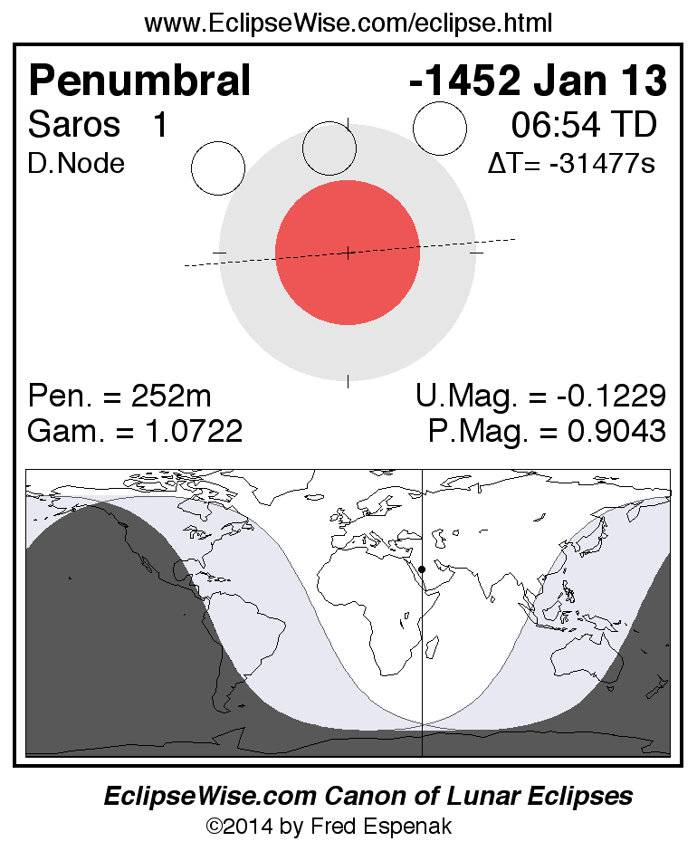 The instant of greatest eclipse takes place on -1452 Jan 13 at 06:53:42 TD (21:26:07 UT1).