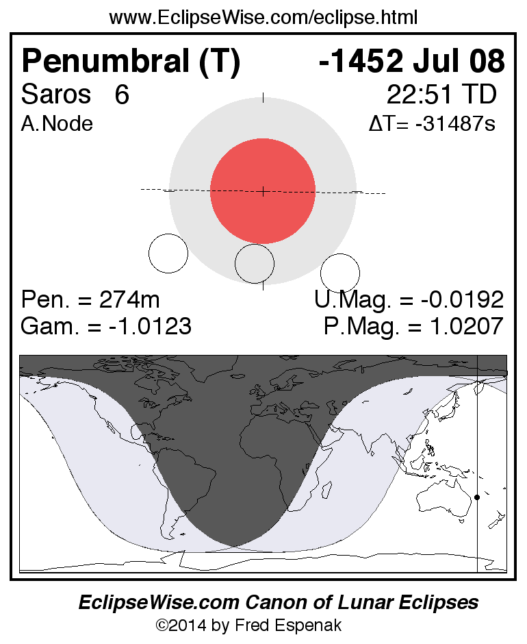 The penumbral lunar eclipse of -1452 Jul 08 is followed two weeks later by a total solar eclipse on -1452 Jul 22.