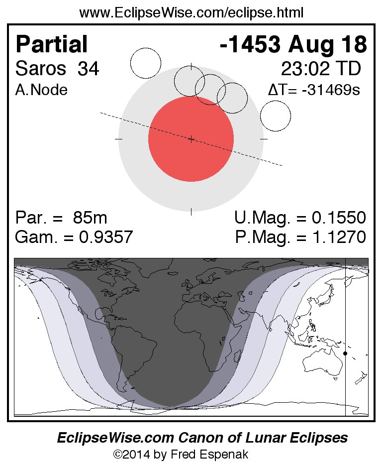 The instant of greatest eclipse takes place on -1453 Aug 18 at 23:02:29 TD (13:34:46 UT1).