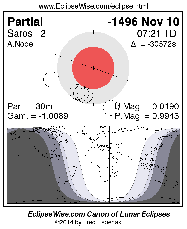 The instant of greatest eclipse takes place on -1496 Nov 10 at 07:20:40 TD (21:38:00 UT1).