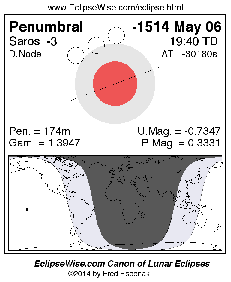 Another lunar eclipse occurs one synodic month after the -1514 May 06 eclipse. It is the penumbral lunar eclipse of -1514 Jun 05.