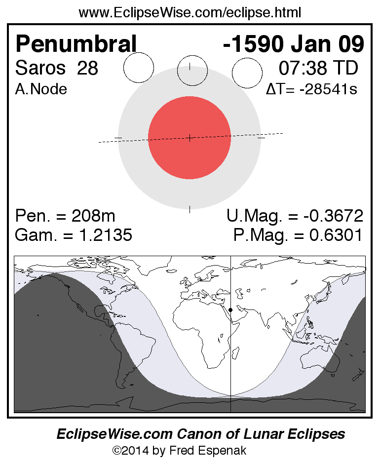 Another lunar eclipse occurs one synodic month before the -1590 Jan 09 eclipse. It is the penumbral lunar eclipse of -1591 Dec 10.