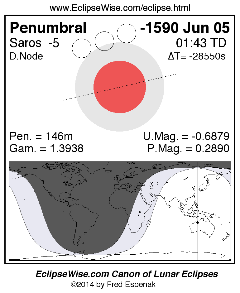 Another lunar eclipse occurs one synodic month after the -1590 Jun 05 eclipse. It is the penumbral lunar eclipse of -1590 Jul 04.
